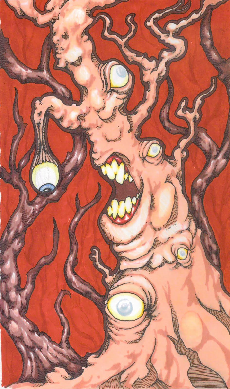 BACKSTORY:This species, although appearing like a large globular tree, covered with flesh & orifices is a global killer. Wherever this species is encountered, it is found in abundance much like a weed, and all other organic life is absent. Rather than a plant, It is more like a super evolved, predatory tube worm. An animal with almost no cerebral capacity, but more of an instinct to eat & survive, much like that of a carnivorous plant, IE. the venus fly trap. The flesh-like bark, teeth and eyes, are all clever deceptions. After extensive research of the animal, we have found that the eyes of the creature are like a fruit. Beginning very small & white, but when fully ripened & ready to fall of the branch, it resembles a fully colored human eyeball. The Fruit of this tree is not nourishing however, but deadly. Extremely toxic & has a 100% mortality rate within 13 minutes. What sets this animal apart from others is that the fruit not only contains toxins, but also enzymes, which the plant uses to break down & liquify all organic matter of the organism which had consumed it. After death the carcass is turned into liquid & absorbed into the soil for nourishment, feeding the tree of vision. Like a tree, each of the eyeball-like fruit contains a seed, or in this case an egg. The organic matter that is broken down by the enzymes is also used to nourish & fertilize the egg for procreation. Recent in depth surveys of planets which these trees inhabit have shown some very strange an disturbing facts. The first is that when root excavation was attempted, we learned that the base of the roots were extremely hard to get to due to large calcium deposits ( presumably from their victims) that had encased the root bases. After much hard work & millions of dollars spent we learned that the entire root system of these organisms were connected proving the fact that it was one large organism that inhabited the planet, rather than several. One other disturbing fact is that primitive written documentation has been found on several planets where this organism inhabits, showing that all intelligent life had gone extinct when long term cohabitation is required. It is thought that these tree like animals were worshipped by primitive peoples & therefore caused their deaths by consumption. The strangest thing, was that all of the aboriginal scrolls & writings from all the different planets ( which were light years apart) were gathered up & compared. It was determined that all of the extinct tribes had referred to the organisms as " The Tree of Vision". This Phenomenon can not be explained, other than the fact, that the tree of vision, may be more intelligent than previously anticipated. Further research is required.